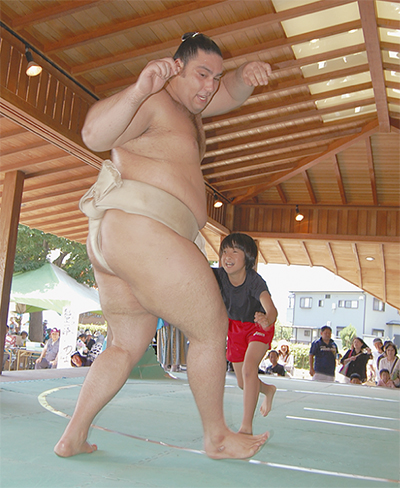 開成あじさい祭で14日、大相撲友綱部屋(東京都墨田区)の魁聖関(27歳・前頭6枚目)との交流イベントが催された。