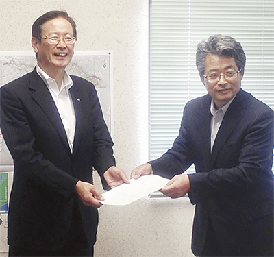 「町民の悲願だった」湯川町長はそう話し横浜国道事務所の杉崎光義所長から連結許可書を受け取った。