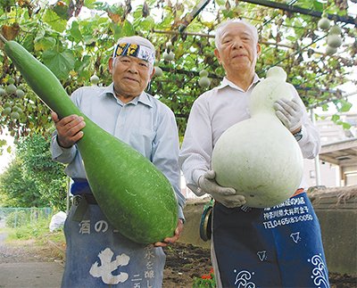 白石会長は「今年は台風の被害もなく無事に収穫できました。ひょうたんはこれから1カ月ほど水に漬けて中身を抜き、会員や希望があった方にお譲りし、加工品などにしてもらいますます」と話す。