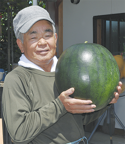 南足柄市怒田で建設業を営む三橋綱範さん(73)の畑でこのほど、高さ・幅ともに30cm、重さ12・7kgの巨大スイカが収穫された。