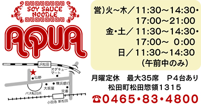 新松田駅北口に8月31日(日)、らーめん店兼ダイニングバーの「AQUA」がオープンする。
