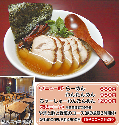 ベースは昔ながらの小田原系醤油らーめん。やまと豚ならではの脂の甘みが凝縮されたスープと、かみしめるたびに口の中に旨みが広がるやわらかなチャーシューを中太のちぢれ麺で味わう。また夜の営業では、やまと豚と地場野菜を使った創作コース料理や各種アルコールも楽しめる。