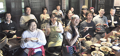 かまどで炊いた県産米キヌヒカリの新米を県西各地から持ち寄ったおかずで味わう企画には食器や食材などを提供した20人が参加。小田原市で4代続く志村屋米穀店の志村成則さん(41)がごはんを炊いた。