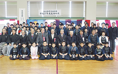 式典後には、上位有段者による日本剣道形、模擬等刀を使った演武なども披露され、同連盟に所属する幼稚園児から年配者までの約70人の剣士たちが、気迫あふれる掛け声とともに剣を交え、1年間の精進を誓い合った。