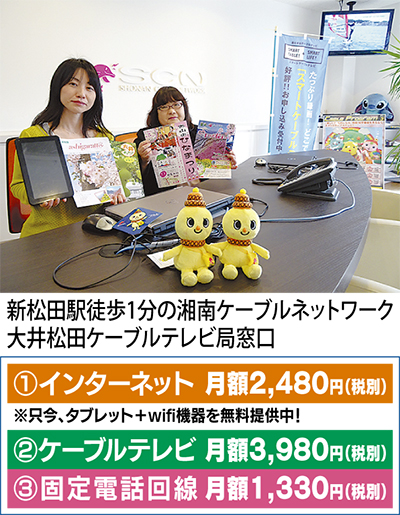 ネットが気になる人へお得な情報が編集室に届いた。大井町と松田町で約1500世帯にインターネット、ケーブルTV、固定電話サービスを提供する「湘南ケーブルネットワーク(株)大井松田ケーブルテレビ局」が、3月31日まで新規加入タブレット贈呈キャンペーンを実施している。