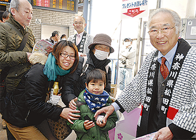 まつだ桜まつりの来場者をもてなそうと2月28日、本山博幸町長と高橋宥二観光協会長が、新松田駅でロマンスカーの乗客100人にポストカードや松田産みかんを使った大福などを配った。7日にも実施する。調布市から来た伊藤定雄さん(62)は「思わぬ歓迎に楽しみが増した」と話した。
