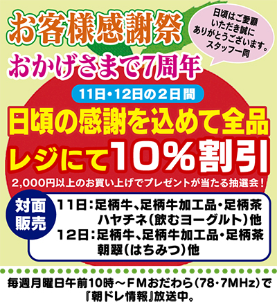 JAかながわ西湘の農産物直売所「朝ドレファ〜ミ♪」の成田店がこのほど、オープン7周年を迎え、4月11日(土)と12日(日)の2日間で日頃の感謝を込めた「お客様感謝祭」を開く。