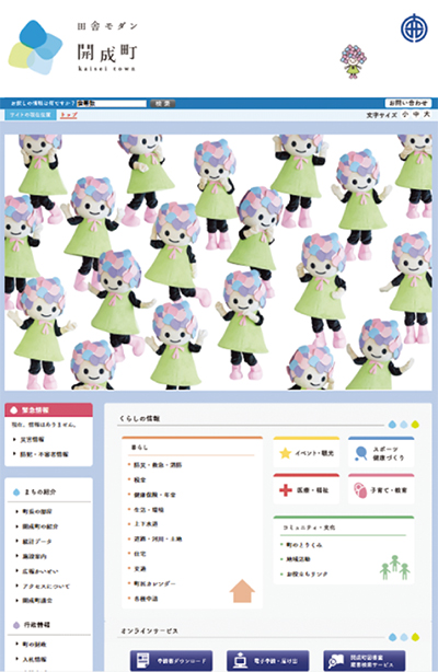 ホームページのトップ画面では、イメージキャラクター「あじさいちゃん」が画面の右側から姿を現し増殖。随所に可愛らしいイラストを用いるなどデザインが洗練された。