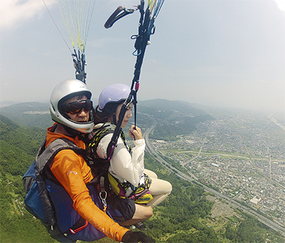 7月20日に本紙記者が、パラグライダーの2人乗り(タンデム)でフライト。