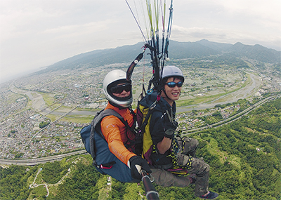山頂からのパラグライダータンデム(2人乗り)フライトが1600円で体験できる(自然条件で中止の場合あり)。さらに新十文字橋上流の河川敷では幼児から高齢者まで体験できる「ハングセーフティトーイング」も開催。座ったまま5メートルほど宙に浮き前進する「滑走体験」を600円で提供する。「年齢問わず楽しめると思います。障害がある方も安心して体験できます」と山崎さん。