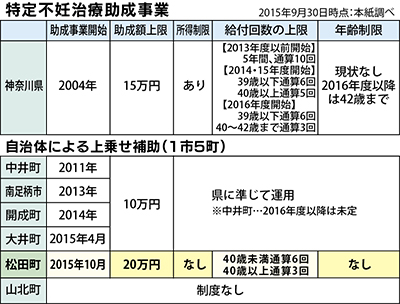 県は16年度から特定不妊治療費への助成対象を42歳までとし、対象年齢に上限を設ける方針だが、松田町では年齢制限を設けずに制度を運用する。