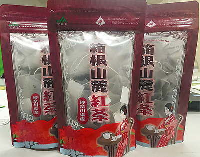 足柄茶の茶葉を100%使用した『箱根山麓紅茶』は、2グラムのティーバッグ13袋入りで1パック500円。茶業センターと若手生産者が2014年夏から研究をはじめた。「足柄茶」の緑茶に用いる一番茶と比べ、二番茶以降の販路が弱かった。そこで足柄茶を原料に使用した紅茶の商品化が検討された。