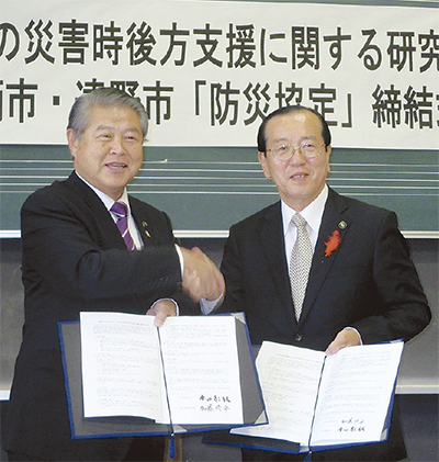 平素の連携とは大規模災害発生時以外にも、両市で防災や災害時の対応などの勉強会を開き、市の防災対策を強化、後方支援に関する研究など必要な取り組みを推進するもの。