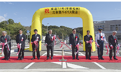 松田町神山から大井町、中井町役場前を経由して平塚市金目の土屋橋へ繋ぐ県道77号比奈窪バイパスがこのほど完成し、10月27日に新設した比奈窪橋で開通式典が開催された=写真。