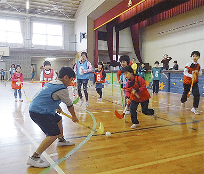 山北町を拠点に活動する総合型地域スポーツクラブ「あすぽ」(瀬戸穂波代表)が23日、町立川村小学校の体育館で設立5周年を記念する「フロアボール体験会」を開催した。