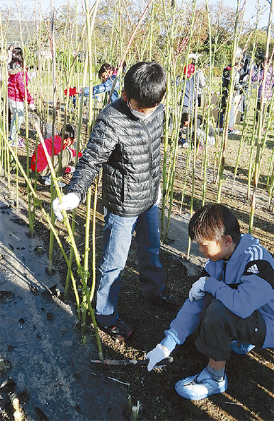 大井町西大井のNEC湘南テクニカルセンターで11月27日、上大井小の5年生55人とNEC職員がケナフの刈り取り作業を行った。