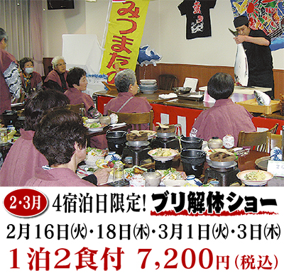 2月と3月には当日限定、料金据え置きの夕食時「ブリ解体ショー」など企画も豊富。みつまたの名所でもあるので、見頃の3月には常連客で賑わう人気のお宿。