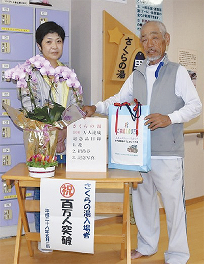 午後3時過ぎにやってきた100万人目の入場者は大井町上大井に住む諸星菊夫さん(68)。仕事の休みを利用して妻の真理さん(55)と足を運んだという。「10年ほど前から通っている」という2人には胡蝶蘭の鉢植えとさくらの湯の招待券などが贈られた。