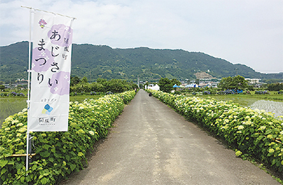 開成町北部に広がる広大な水田地帯の農道で約30種5千株のあじさいが楽しめる「開成町あじさいまつり」が今日6月4日(土)に始まる。12日(日)までの9日間、「虹色の田園風景」が見物客を出迎える。