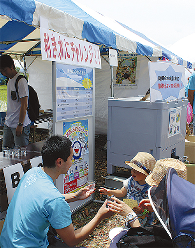 6月4日、あじさいまつりの会場で町が実施したイベントには2時間で122人が足を運び、職員が用意した開成町の水道水と市販のミネラルウォーター2種の味比べをしてもらった。