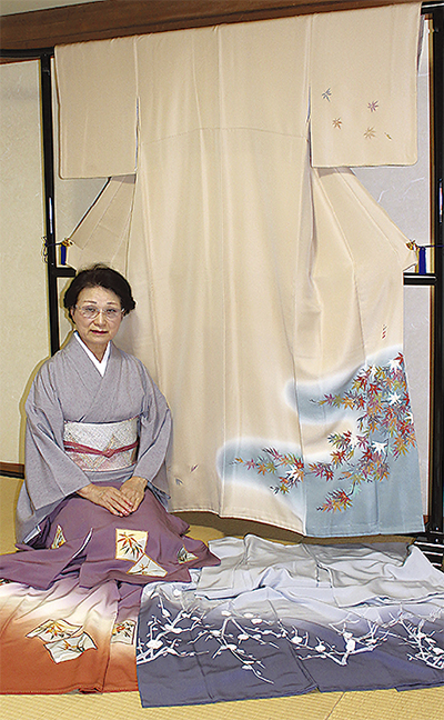 絵を描くのが好きだった奥津さんは、武蔵野美術大学へ進学。その後、友禅染の染工芸家、吉田勇四氏に師事して、手描き友禅染の技術を学んだ。通常は各工程を分業制作することが多いが、奥津さんは下絵から地染めまで、12工程すべてを一人で手がける。