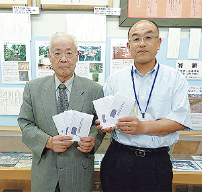 文化財保護委員で郷土史家の香川順次さん(84)=写真左らの協力を得てできあがった冊子には、町内のマップと道祖神の写真などをカラーで収録した。香川さんは「昔の風習がなくなり寂しくなった。子どもたちに手にとって見てもらいたい」と話している。
