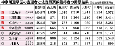 定数4議席の神奈川選挙区では比例代表から神奈川選挙区に鞍替えした自民現職の三原じゅん子氏(51)が100万票超えでトップ当選。公明新人の三浦信祐氏(41)、民進元職の真山勇一氏(72)、無所属(9日付自民公認)の現職中西健治氏(52)が議席を獲得。トップの三原氏は1市5町全てで県平均を上回る得票率だった。中西氏は2010年の参院選神奈川選挙区で旧みんなの党から当選。党の解党で無所属となったが財務大臣の自民党・麻生太郎副総裁が参院財政金融委員会での質疑などを評価。今回の参院選では自民党推薦候補として麻生グループが支援した。