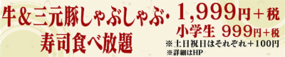 まぐろ、サーモン、海老、つぶ貝など、豊富な11種類のネタと新鮮な肉が一度に味わえるしゃぶしゃぶ・にぎり寿司食べ放題コースは税別1999円〜(小学生は税別999円〜)。