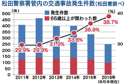 「他地域と比べて高齢者が自ら運転する機会が多い」と話すのは松田警察署交通課の黒木和英課長。「ドライバーの資質や道路状況の問題ではないと思う」と付け加える。
