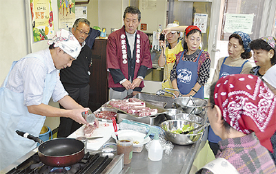 第2回目となる今回は『足柄牛』を調理した。B級グルメのコリコリ焼きや味噌漬けを調理した後に、分厚いステーキが登場。1枚250gのサーロイン、全部で5kgを提供した(株)門屋食肉商事の二宮慶晃さんは「イベントなどでお世話になっている。町に恩返しできれば」と話した。同社工場長とともに「強火でドリップを閉じ込める」焼き方のコツを伝授。参加者はたっぷりの肉汁に歓声をあげ舌鼓を打っていた。