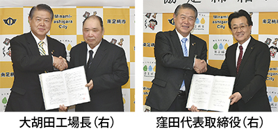 南足柄市が3月15日に大和紙器(株)(窪田英志代表取締役)と、28日に豊玉香料(株)小田原工場(大胡田稔工場長)と防災協定を締結し、協定書を交わした。