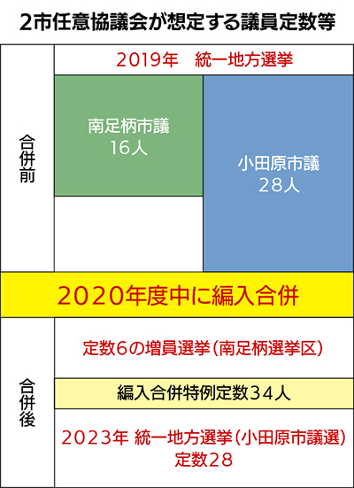 任意協議の想定通り20年度中に両市が合併した場合は、合併後50日以内に南足柄選挙区で定数6の増員選挙が行われ、23年の通常選挙まで小田原市議の議員定数28から34に増員される。新市の議員定数は一時的に34となるが、23年の通常選挙で28に戻る、と想定している。