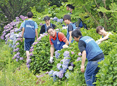 6月に開催され18万7千人が訪れた、開成町のあじさいまつり。町内外のボランティアによる、まつりを彩ったアジサイの剪定が1日に行われた。