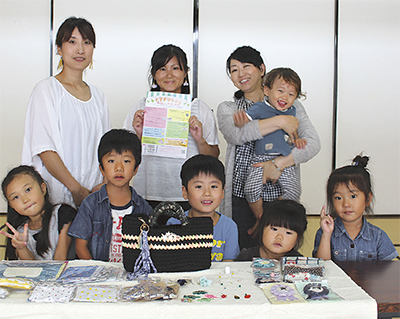 このグループは町が主催する子育て世代向けの催しなどで知り合った堀岡一美さん、辻村麻美さん、鈴木朋子さん、水野咲穂香さんが1年半前につくった子育てグループ。アクセサリー作りや布小物づくりが趣味で、お互いの家で作品作りを教えあい交流していた。