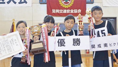 優勝チームのメンバーは開成南小5年の畠山泰一(たいち)くん、阪上心音(ここね)さん、鈴木里和(りお)さん、山崎夏沙(なさ)さん。毎日4時間の練習に打ち込み大会に臨み「名前が呼ばれた時はうれしくて涙がこぼれた」(鈴木さん)と優勝の喜びを分け合った。