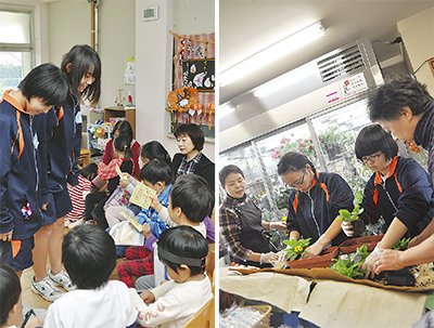市立岡本幼稚園(松下美恵子園長)では、年少クラスのさくら組で生徒2人が先生の仕事を体験した。園児と「お店屋さんごっこ」で遊び、帰り際に家庭への手紙を配る手伝いもした。