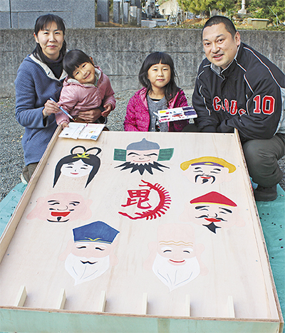 縦120センチメートル、横90センチメートルで、妻の夏美さん(36)が七福神を描いた。娘の小百合ちゃん(6)と明香里ちゃん(3)も彩色を手伝い、当日に向けて作業を進めている。毘沙門天祭は1月7日(日)午後5時から。