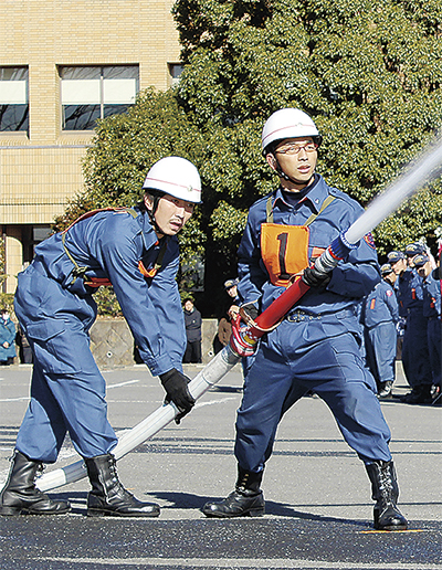 大井町の消防出初式が12日に総合体育館駐車場であり、上大井地区を管轄する大井町消防団第3分団(福田隆行分団長、団員19人)が消防ポンプ車の消火活動を披露した。この中に聴覚障害を乗り越えて消防団員として活躍する宇佐美俊太団員(上大井・35歳)の姿があった。