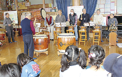 この催しは、子どもたちに昔ながらの遊びや文化を伝えようと3年前に始まった。今年は地域に伝わる道祖神太鼓を「町の民俗芸能にしよう」と活動する70代以上の有志8人が太鼓演奏を披露。ほかにも「あしがらあそびの学校」の柳川幸也さん=関連記事に人物風土記=がコマ回し、「ふたりしずかの会」の滝本小夜子さんがお手玉の遊び方を子どもたちに紹介した。