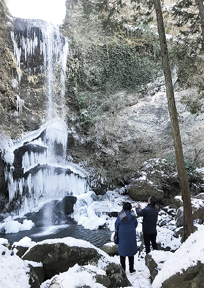 今シーズン初の積雪とその後の寒波の影響で、南足柄市の観光名所「夕日の滝」が凍り、観光客の目を楽しませている。