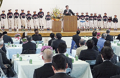 松田町少年野球育成会「松田キャッスルズ」(天野力監督)の創立40周年記念式典が10日、松田町体育館で開かれ、チームとゆかりのある横浜高校野球部前監督の渡辺元智さんや星槎国際湘南の土屋恵三郎監督、支援者、卒団生、現役部員ら100人が出席した。