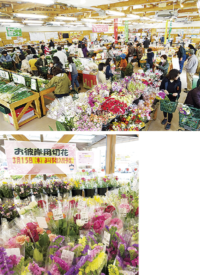 ネーブルオレンジ、はるみ、はるか、キウイなどの果物や、ダイコン、新玉ねぎ、ほうれん草、いちごなども揃う。色鮮やかなストックや小菊など「お彼岸用切花」も豊富に揃うなど、この時季ならではの県西地域の春が楽しめる。通常水曜定休の成田店はお彼岸中日の21日(水)は臨時営業する。ハルネ店は定休日なしで毎日営業中。