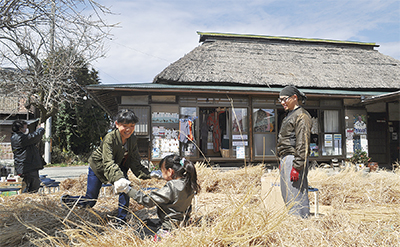3月初めには有志26人で静岡県富士宮市の朝霧高原で茅刈りを行い、補修に使う茅200束を搬入。この日は子どもたちも参加して、束ねた紐を一旦ほどき根元を揃え、雑草を取り除く作業に汗を流した。