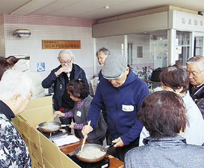 第2部では関さんが考案した非常食レシピを調理。避難所にいることを想定して野外でアルファ米やカップ麺、サバの缶詰などを使ってチャーハンやサバ汁など5品を作り試食した。「簡単に作れて美味しい」「体が温まって良い」などと声があがっていた。