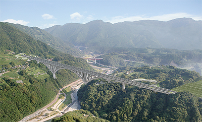 河内川を横断する計画のこの橋は、国内で3例目となるコンクリート構造の「バランスドアーチ橋」で、両岸の山に深さ30メートルの穴を掘削して直径16メートルの基礎を打ち込み、その上に橋脚を施工する。最大支間長220メートルの橋脚部分から同時にコンクリートのアーチを伸ばしてバランスを取る。