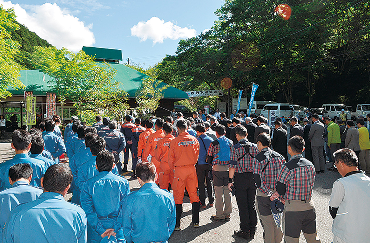 山北町中川の西丹沢ビジターセンター前の駐車場で20日、西丹沢山開きが行われ、山北町観光協会や松田警察署、小田原市消防、地元消防団などの関係者およそ100人が出席した。