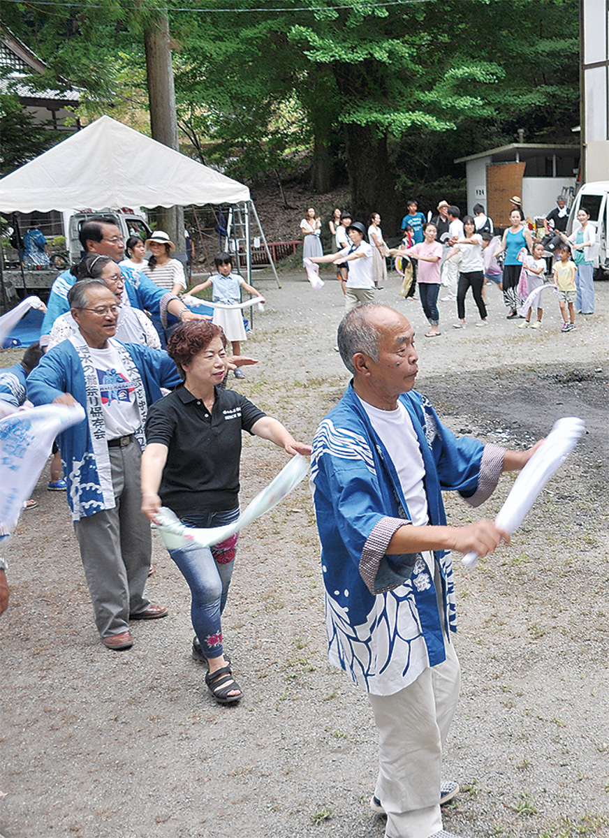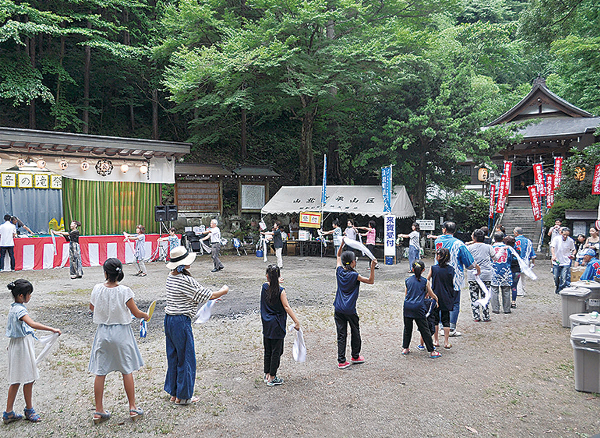 祭り終盤の午後6時過ぎ、ヒグラシの鳴き音が響く境内に洒水の滝音頭の曲が流れると、子どもから大人まで約50人が踊りの輪をつくり、子どもたちも見よう見まねで踊りを楽しんでいた。