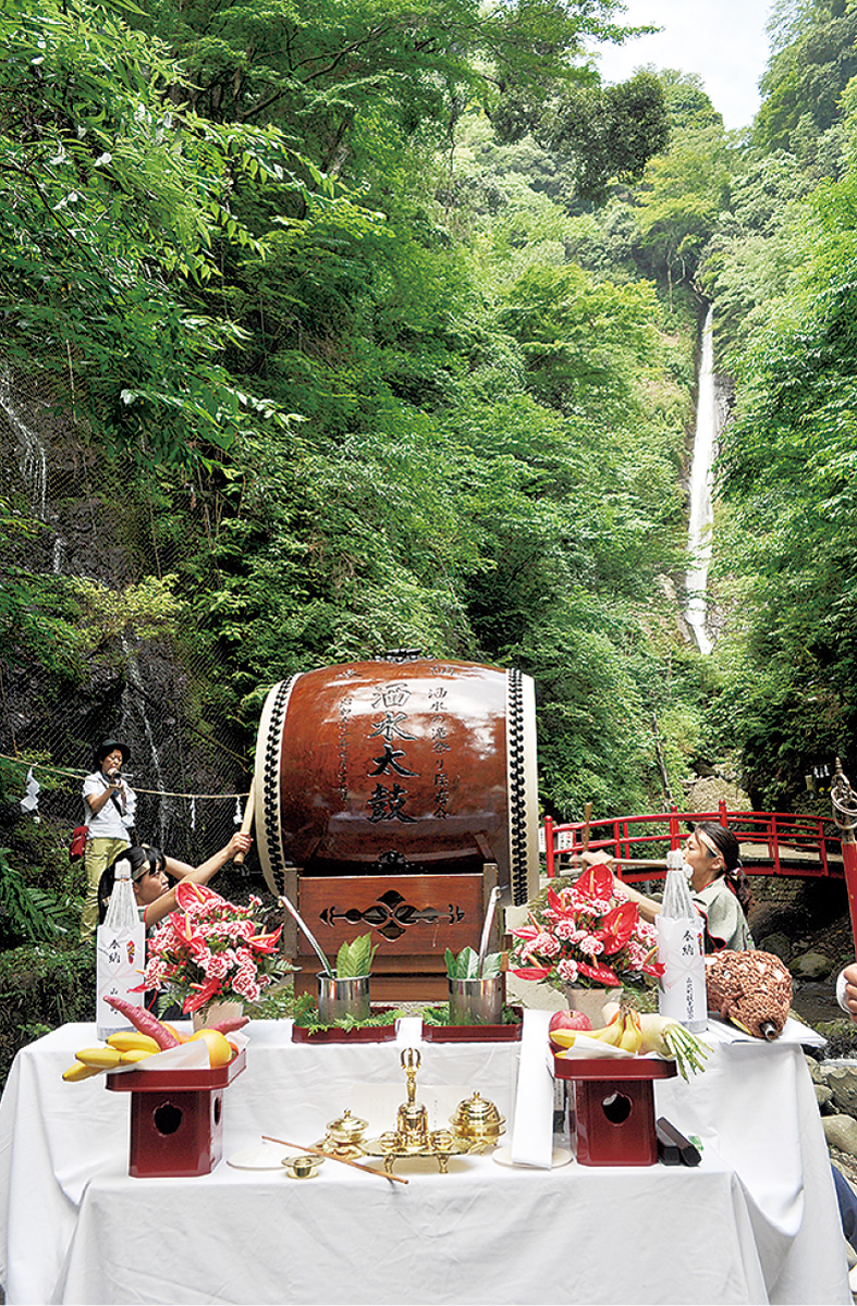 地元出身の中村恵さん(33)と稲葉文香さん(25)が洒水太鼓の演奏を奉納。地元消防団や寺の住職らによる「名瀑おろし」で観光客の安全を祈願した。