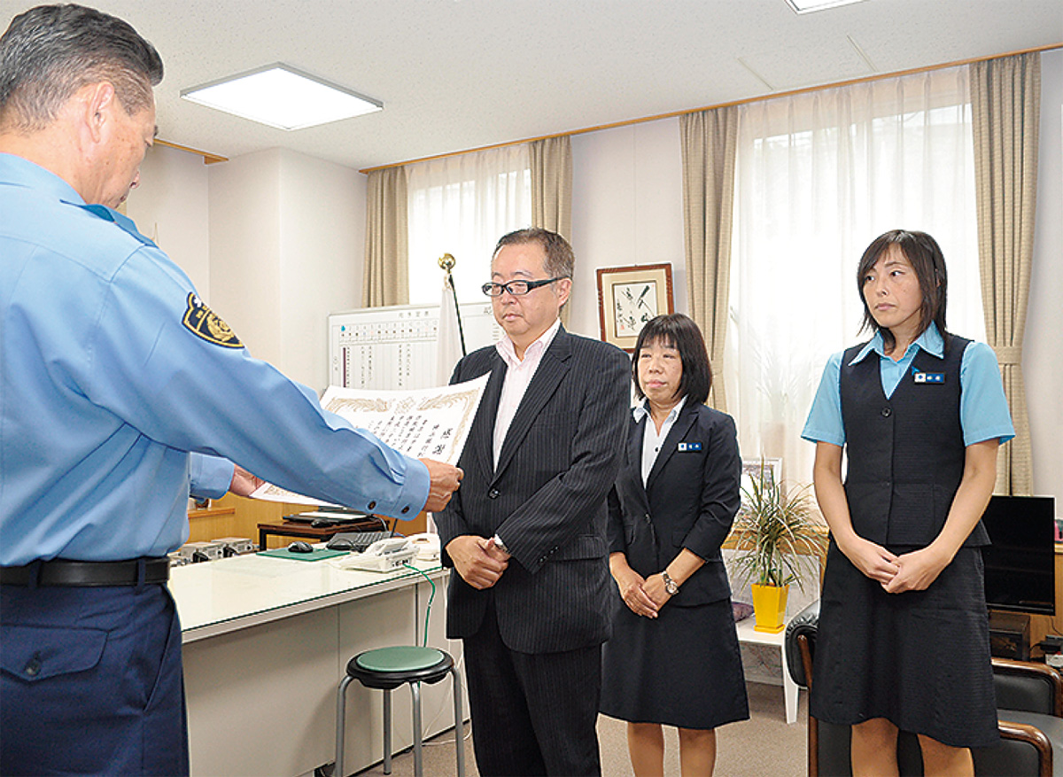 横浜銀行松田支店に勤務する奥津正司支店長と松本ますみさん、蜂屋里美さんの3人が2日、振り込め詐欺の被害を未然に防いだとして、松田警察署の大泉重弘署長から感謝状の贈呈を受けた。