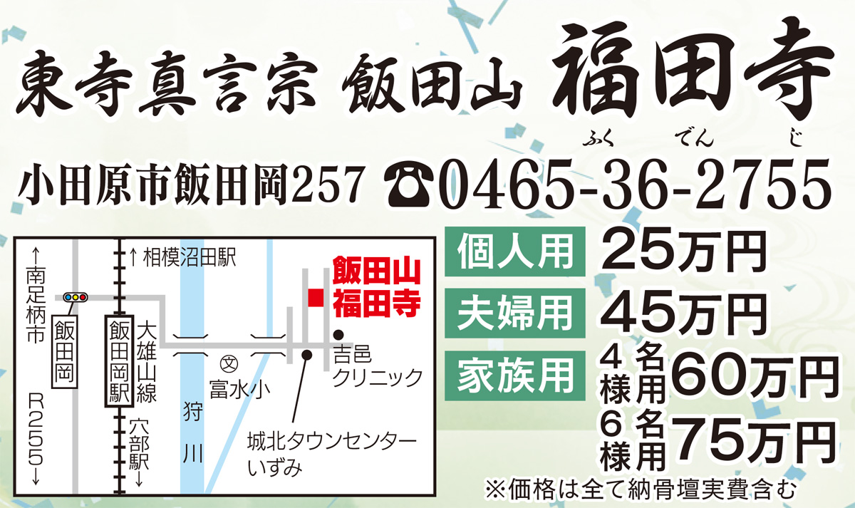 平安時代から弘法大師の教えを伝える古刹、飯田山福田寺に納骨堂が完成して3年半。各家・各人が各々の納骨壇をもつ小田原で初めての形式で、お墓と同じようにいつでも自分の家の納骨壇に礼拝供養ができる。個人用から夫婦用、家族用まで納骨壇の大きさは様々。特に夫婦用、家族用(4人)が人気で、夫婦用は第1期分32基が終了、第2期分18基の予約申し込みが9月1日(土)から始まる。